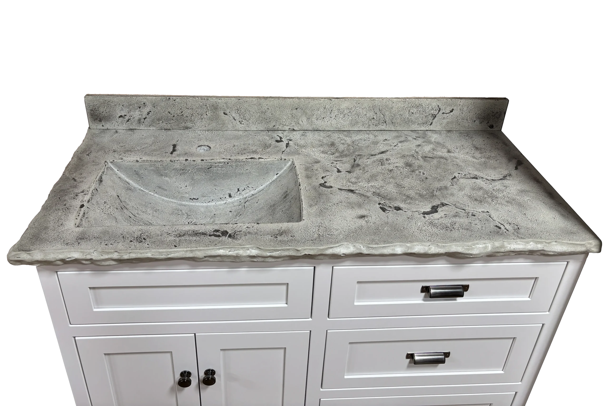Elevate your space with White Smoke Distressed concrete countertops. This creamy off-white features bold, dramatic veining and textured detailing for an artfully refined aesthetic. Perfect for statement-making kitchens and baths, it combines vintage character with contemporary sophistication. Hand-cast with customizable edge details.